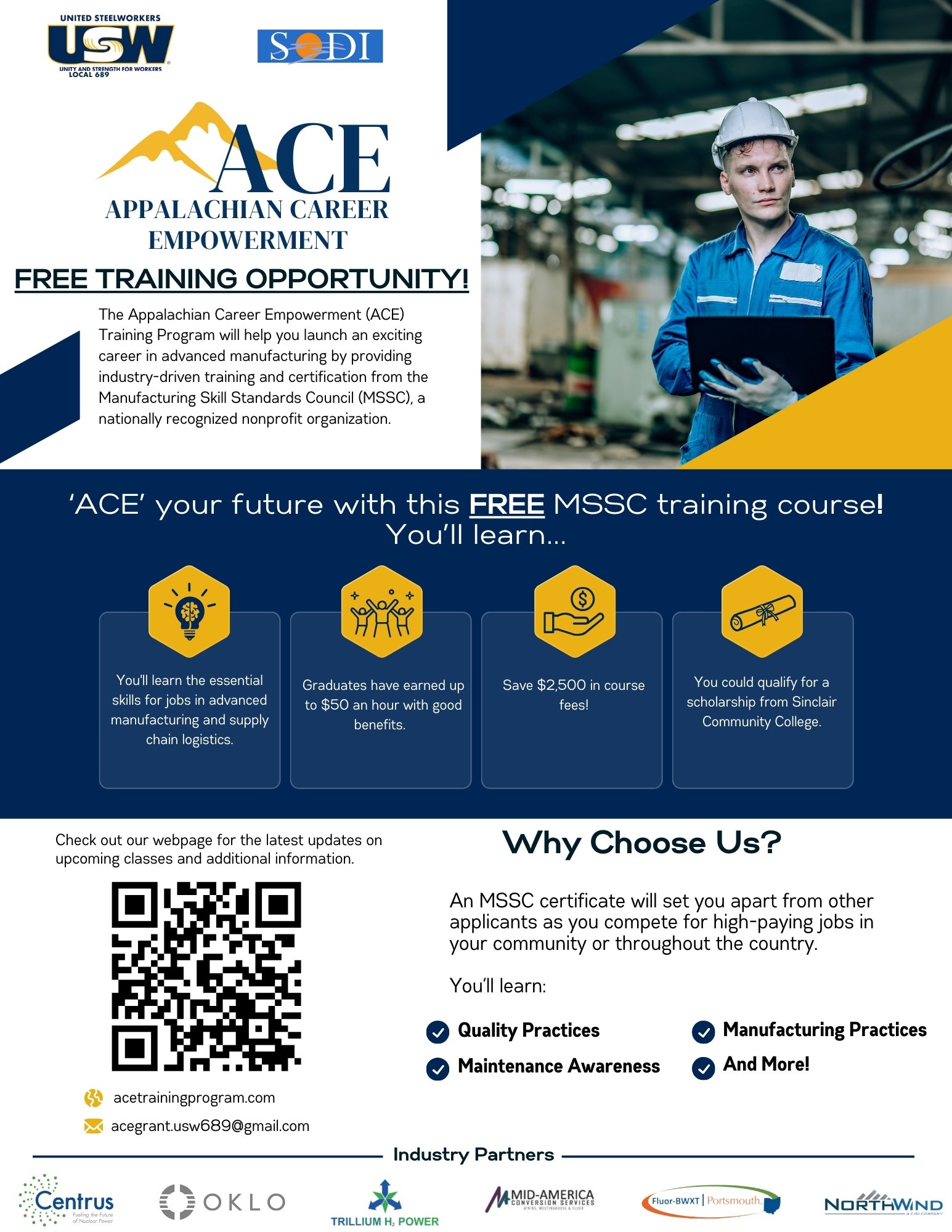 The Appalachian Career Empowerment (ACE) Training Program, offered by USW Local 689 in partnership with the Southern Ohio Diversification Initiative (SODI), featuring nationally-recognized curriculum developed by the Manufacturing Skill Standards Council (MSSC), provides industry-driven training and certifications to help you launch a career in advanced manufacturing. Earning the MSSC Certified Production Technician (CPT) ® 4.0 certification will set you apart from other applicants, giving you a competitive edge for high-paying jobs in your community or across the country.